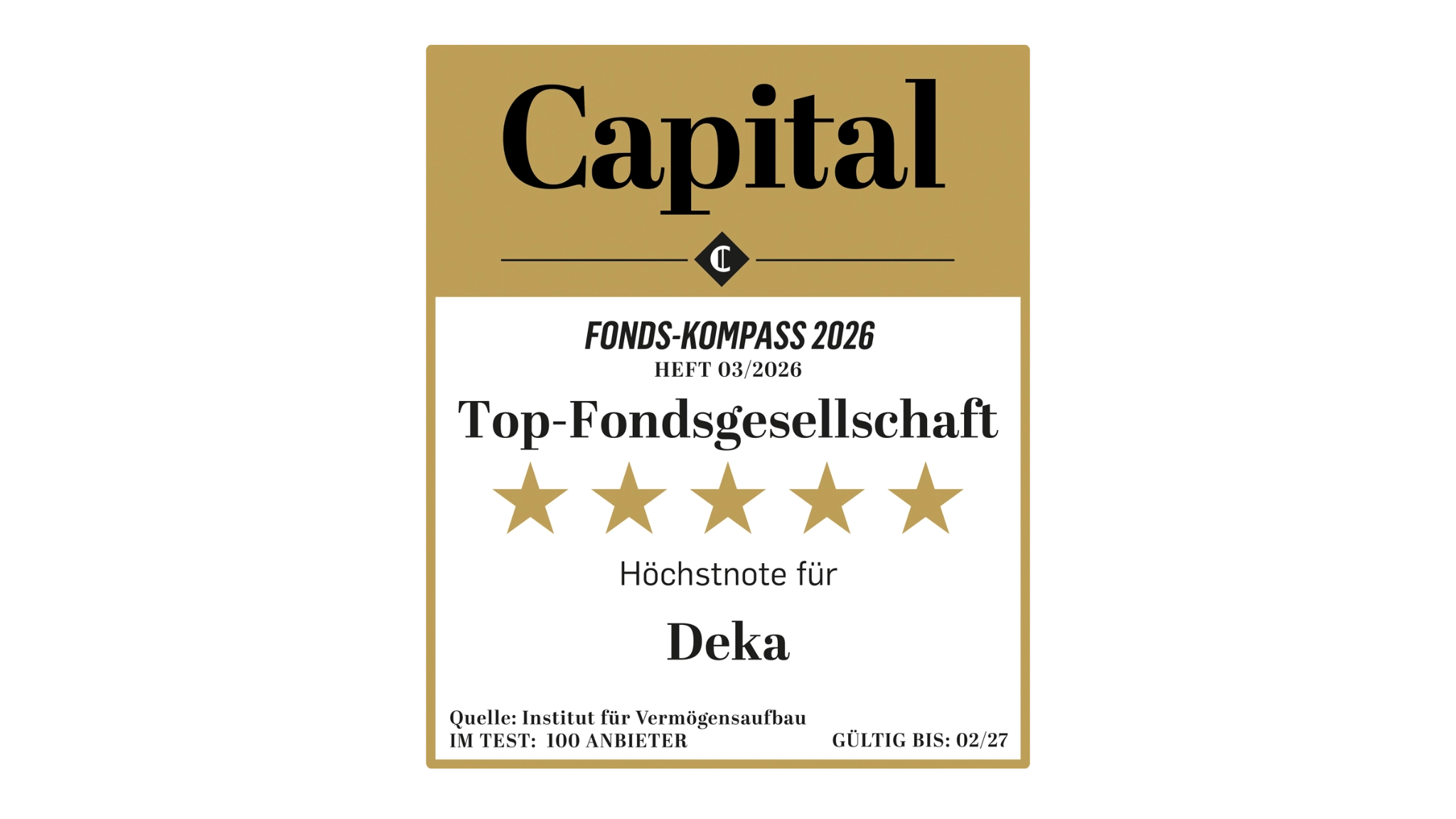 Im diesjährigen Fonds-Kompass hat das Wirtschaftsmagazin Capital die Deka als besten Universalanbieter ausgezeichnet. Insgesamt erreichte das Wertpapierhaus der Sparkassen Platz 2 unter den 100 wichtigsten Fondsanbietern in Deutschland und erhielt bereits das 14. Mal in Folge die begehrte Höchstnote von fünf Sternen. Dieses hervorragende Abschneiden zeigt einmal mehr, dass die Deka für ihre Anlegerinnen und Anleger sehr gute Resultate erzielt.